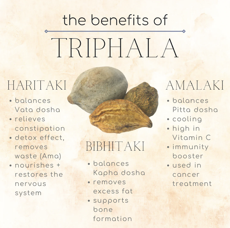 Název triphala znamená „tři plody“ a označuje kombinaci plodů amalaki, bibhitaki a haritaki. Každý z těchto plodů má v ajurvédské tradici své specifické vlastnosti a dohromady vytvářejí vyvážený celek.