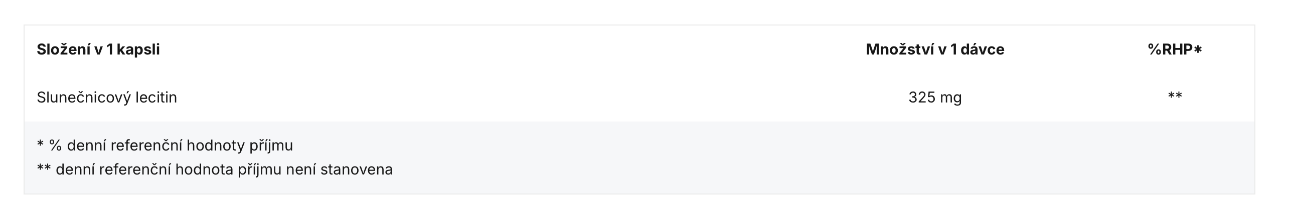 Složení: Slunečnicový lecitin (325 mg, RHP **), Rostlinná kapsle na bázi HPMC. Neobsahuje žádné balastní látky (éčka).