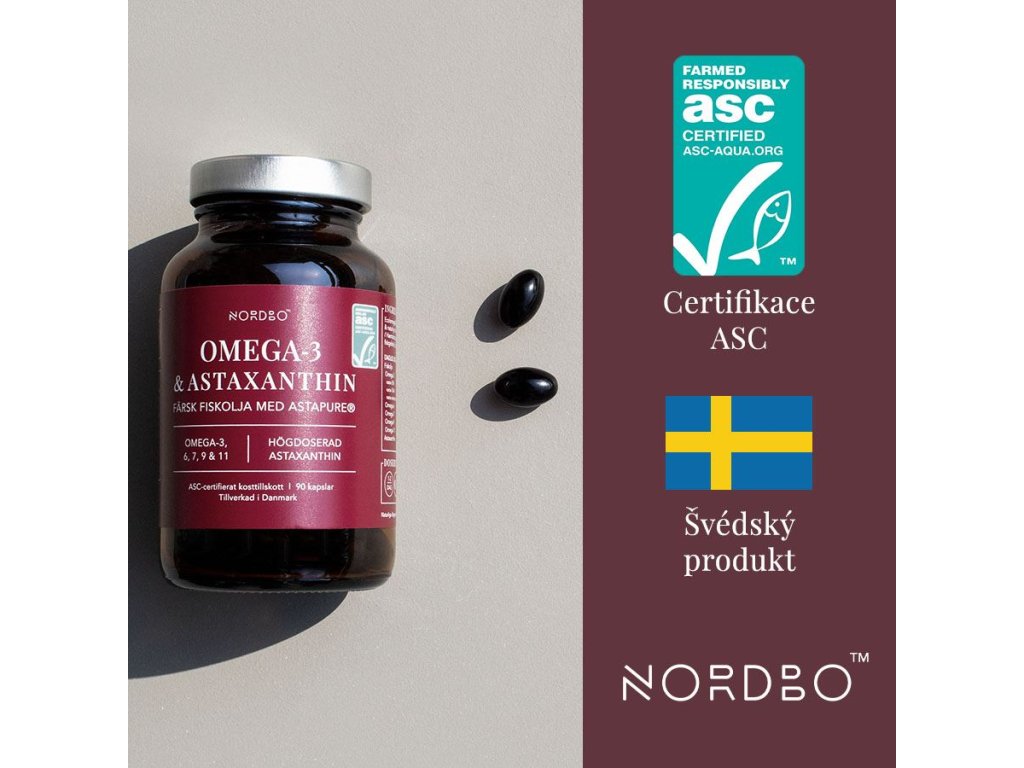 Omega 3 & Astaxanthin je naprostou špičkou mezi produkty zaměřenými na oxidativní stres. Obsahuje obrovsky silnou kombinaci oleje ze skandinávského pstruha s certifikací ASC (garance čerstvosti a čistoty) a astaxanthin extrahovaný z červené řasy a vyráběný pod ochrannou známkou Asta Pure®.
