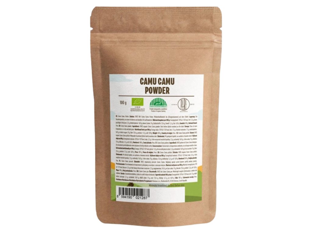 Camu Camu je tropické ovoce původem z amazonských oblastí Peru. Ve formě sušeného BIO prášku patří mezi potraviny s jedním z nejvyšších přirozených obsahů vitamínu C – jedna čajová lžička (cca 5 g) obsahuje přibližně 680 mg tohoto důležitého antioxidantu. To je více než 10× tolik, co běžný pomeranč. Součástí Camu Camu jsou také přirozeně se vyskytující stopová množství dalších látek, jako je železo, měď, mangan, draslík, zinek či beta-karoten – tedy forma vitamínu A.