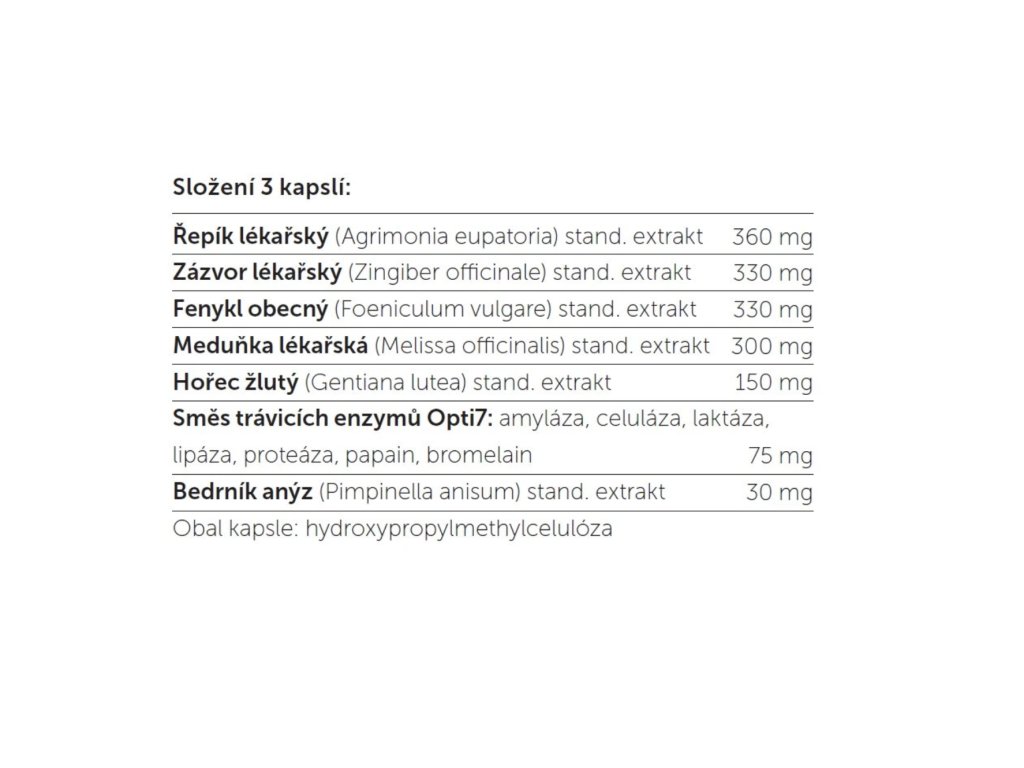 Řepík lékařský (Agrimonia eupatoria) stand. extrakt, Zázvor lékařský (Zingiber officinale) stand. extrakt, Fenykl obecný (Foeniculum vulgare) stand. extrakt, Meduňka lékařská (Melissa officinalis) stand. extrakt, Hořec žlutý (Gentiana lutea) stand. extrakt, Směs trávicích enzymů Opti7: amyláza, celuláza, laktáza, lipáza, proteáza, papain, bromelain, Bedrník anýz (Pimpinella anisum) stand. extrakt