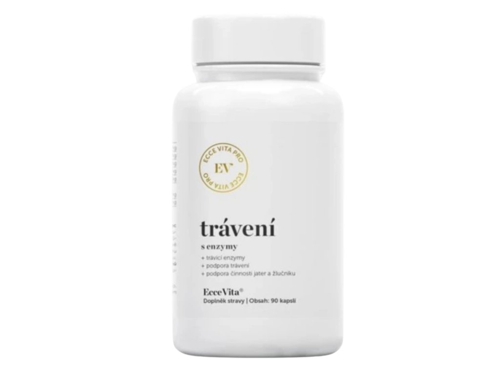 Ecce Vita® Trávení s enzymy obsahuje 90 kapslí z rostlinné celulózy ve kterých je směs standardizovaných extraktů 6 bylin spolu s komplexem 7 trávicích enzymů. Tato kombinace pomáhá jemně přirozenému trávení, podporuje vstřebávání živin a snížení nadýmání.